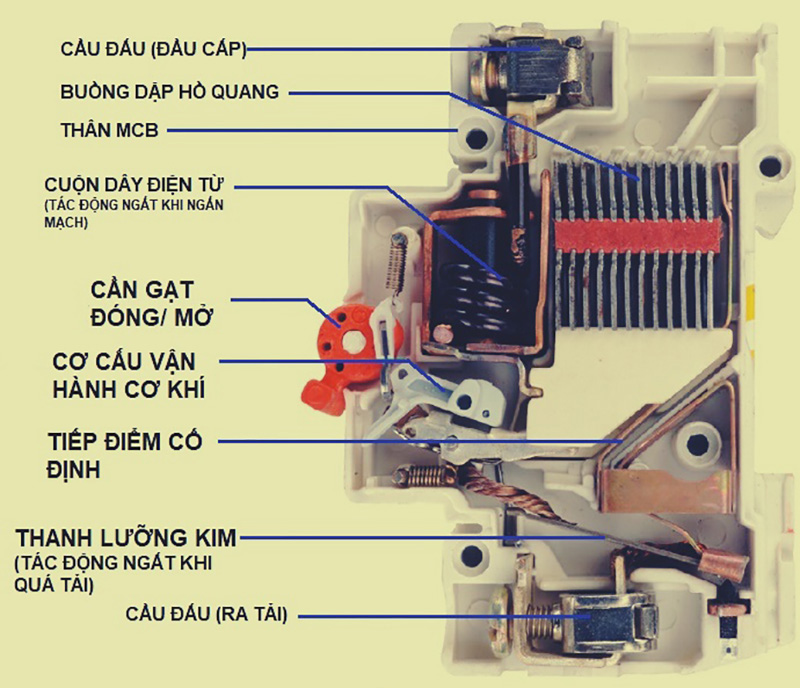 1. Nguyên lý nhiệt năng : Bảo vệ quá tải của MCCB qua phần nhạy cảm với nhiệt độ. Thành phần này chính là 1 thanh lưỡng kim. Nếu hai kim loại giãn nỡ ở các tốc độ không giống nhau thì lúc đó sẽ tiếp xúc với nhiệt độ cao. Trong điều kiện hoạt động bình thường, thanh lưỡng kim sẽ cho dòng điện chạy qua MCCB ( Át Khối ). Mội khi dòng điện đã vượt quá mức cho phép, tiếp xúc lưỡng kim sẽ bắt đầu nóng và uống cong do tốc độ giãn nở nhiệt không giống nhau của 2 kim loại. Tiếp điểm (thanh kim loại) sẽ bị uốn cong đến điểm đẩy vật lý vào thanh ngắt và tháo rời các tiếp điểm. Điều đó làm cho mạch bị gián đoạn.
