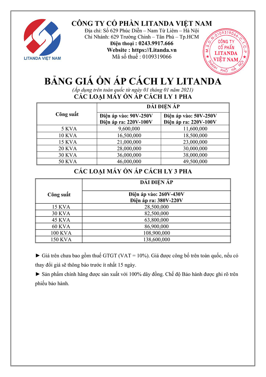 Nếu mọi người đang tham khảo giá biến áp cách ly cho gia đình. Thì sau đây là giá biến áp cách ly Litanda đang được rất nhiều gia đình tin dùng:
