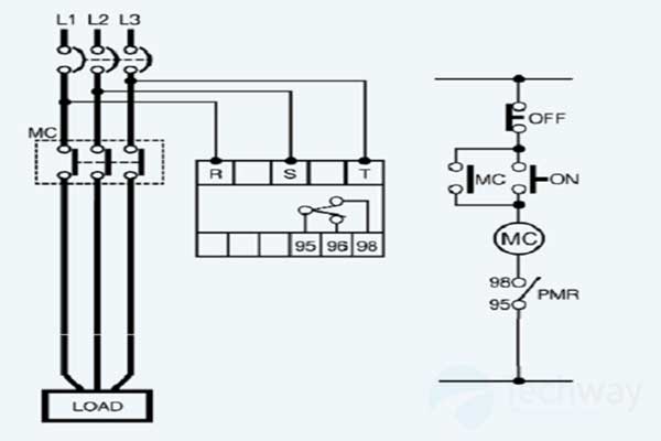 Còn ở phần điều khiển, ta xài tiếp điểm thường đóng (98,95) nối như hình vẽ Rơ le phát hiện mất dây pha thì sẽ ngay lập tức chuyển thành thường hở ngắt cuộn hút của Contactor ra. Ba tiếp điểm thường hở của Contactor sẽ ngắt tải ra trước khi bị hư hại.