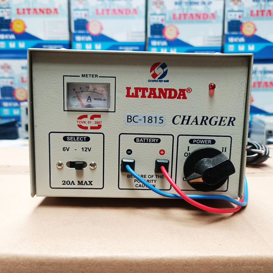 Máy nạp ắc quy LiTanda mã model BC-1815 do công ty cổ phần LiTanda Việt Nam sản xuất có dòng tải max 15A. Máy nạp có điện áp 1 chiều 6V-12V. Sản phẩm được sử dụng nhiều cho bình ắc quy từ 5AH đến 150AH