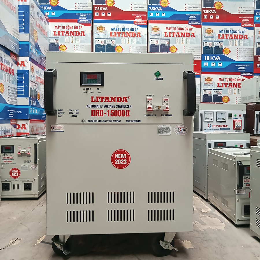 Máy ổn áp 15KVA 1 pha dải 50v~250v LiTanda new 2023 được trang bị đồng hồ điện tử màu trắng kết hợp chức năng Aptomat đảo chiều. Ngoài ra máy được tính hợp chức năng báo điện áp đầu ra giúp kiểm tra nguồn điện vào liên tục.