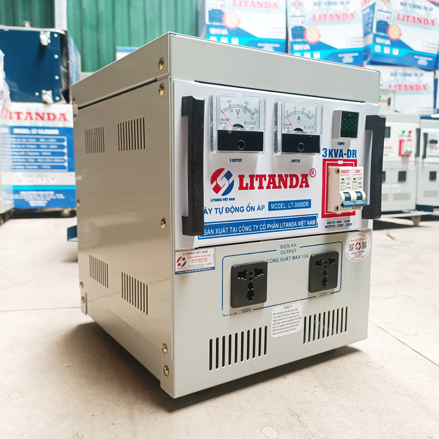 Ổn áp Litanda 3KVA 1 pha có dải điện áp vào 90V-250V, điện áp ra 220V, 110V và 100V. Sản phẩm phù hợp sử dụng ở những khu vực điện không quá yếu. Tuy nhiên đây là dòng công suất nhỏ ít được sử dụng.